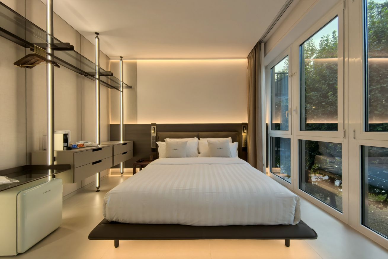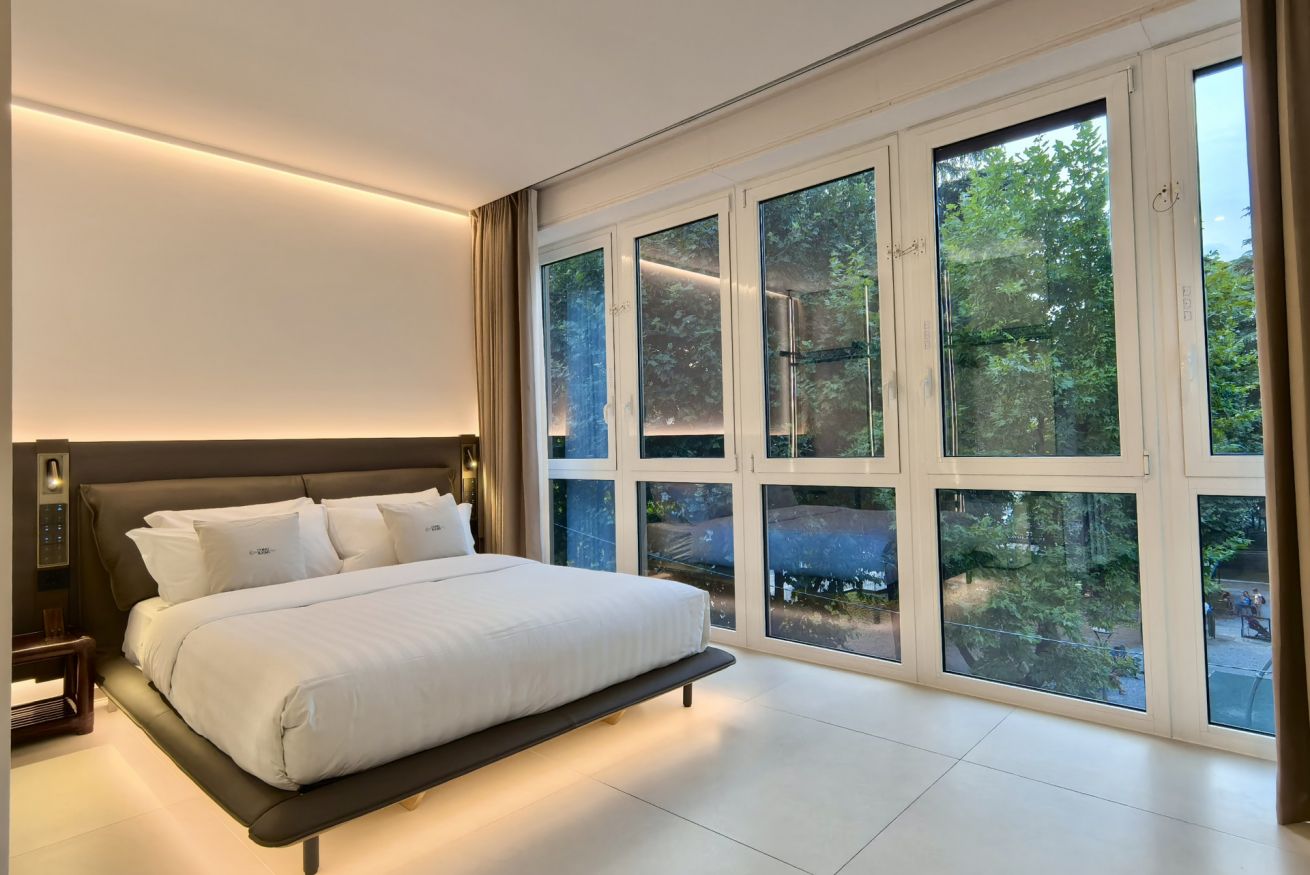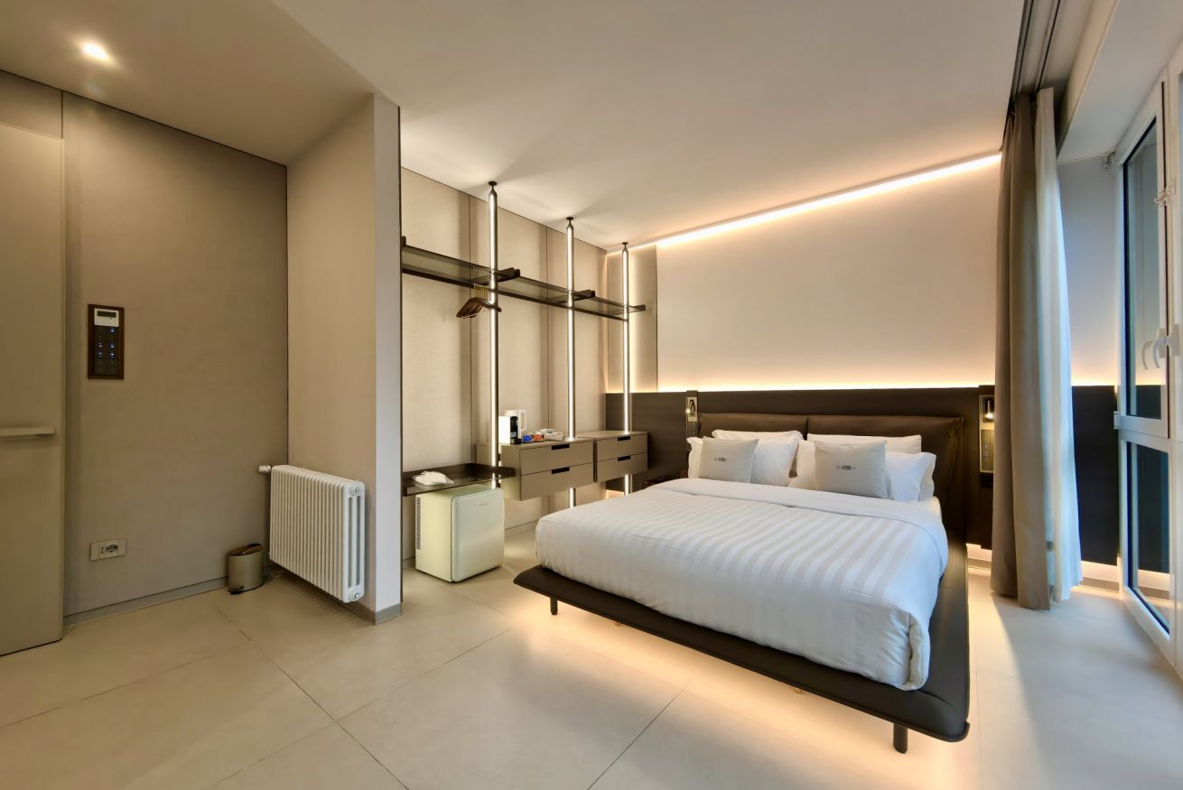 Le camere doppie esprimono lo stile moderno ed elegante della struttura: arredamento contemporaneo, finiture di pregio, illuminazione di design e letti matrimoniali king size con biancheria di alta qualità. Le ampie finestre garantiscono una piacevole luminosità naturale e rendono gli ambienti accoglienti per tutto il giorno.