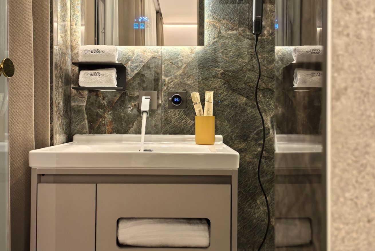 I bagni privati sono dotati di comfort e tecnologie avanzate: spaziose docce in cristallo con vetri intelligenti a privacy regolabile, WC elettronici di ultima generazione con funzioni automatiche e sistemi di igiene integrata, oltre a scaldasalviette di design per asciugamani sempre caldi. L’acqua è regolabile con precisione per offrire un’esperienza personalizzata. Completano l’ambiente un asciugacapelli e un set di cortesia.