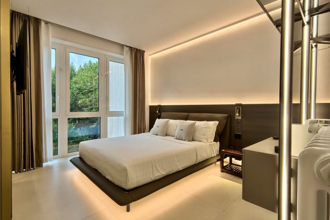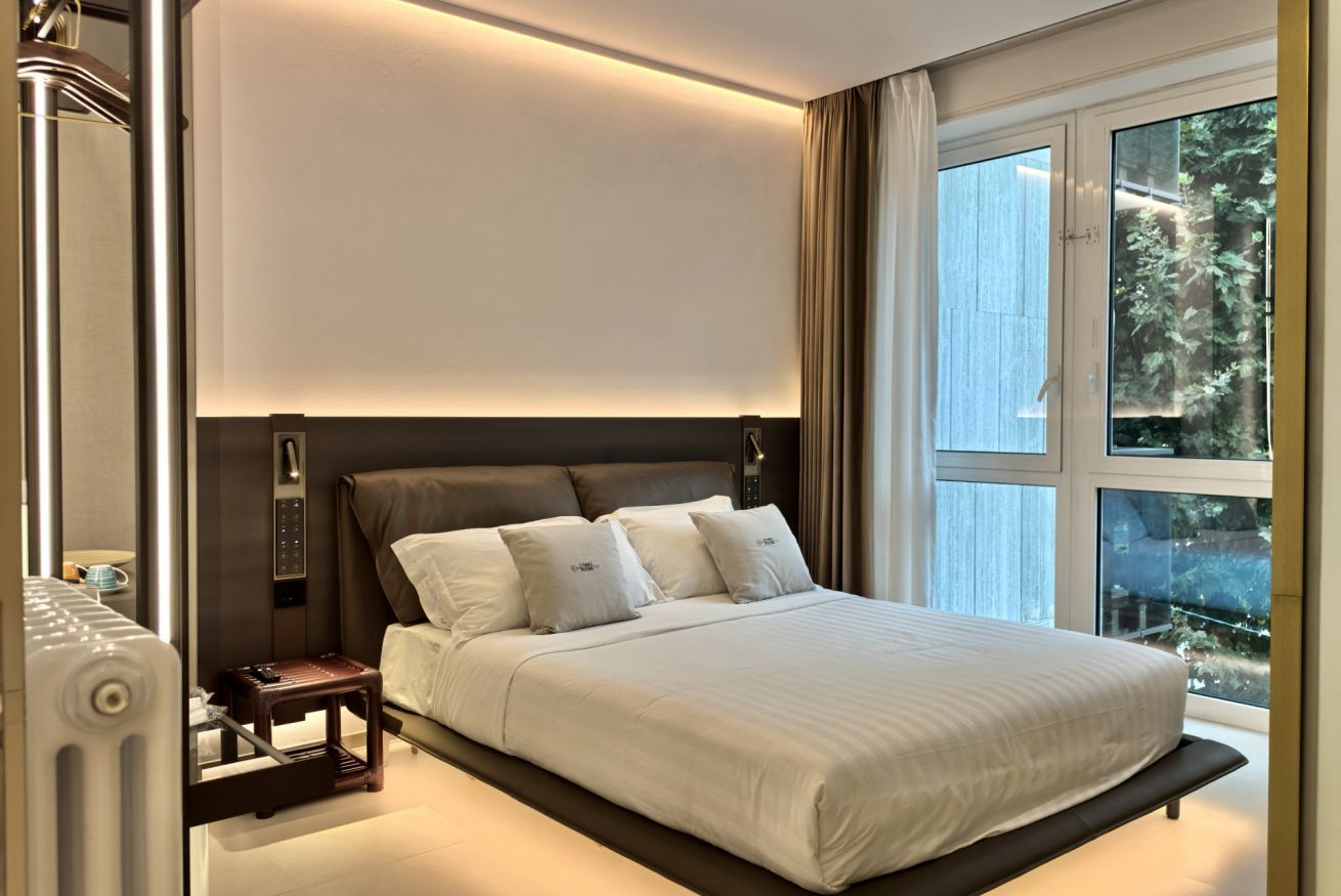 Le camere doppie esprimono lo stile moderno ed elegante della struttura: arredamento contemporaneo, finiture di pregio, illuminazione di design e letti matrimoniali king size con biancheria di alta qualità. Le ampie finestre garantiscono una piacevole luminosità naturale e rendono gli ambienti accoglienti per tutto il giorno.